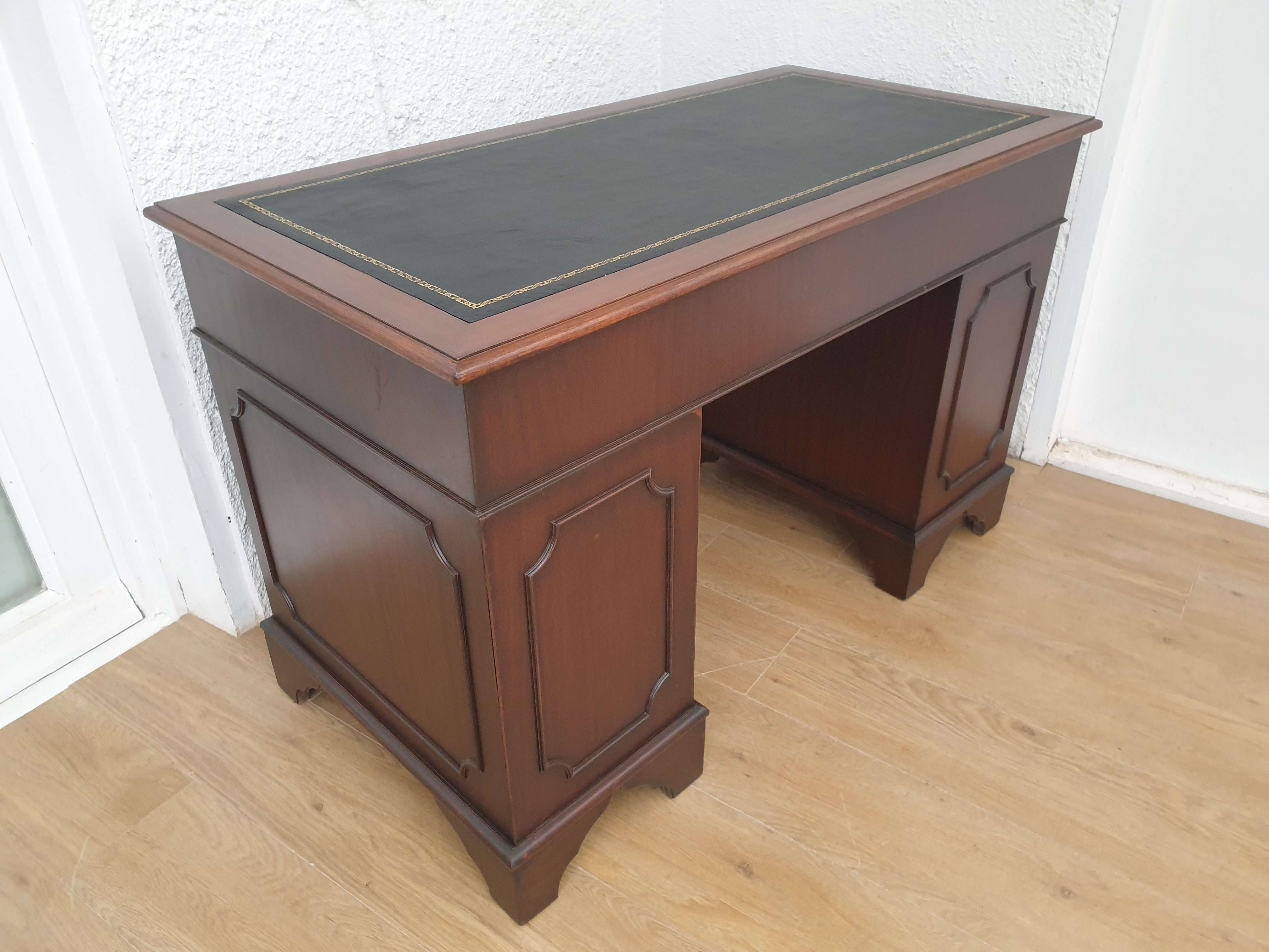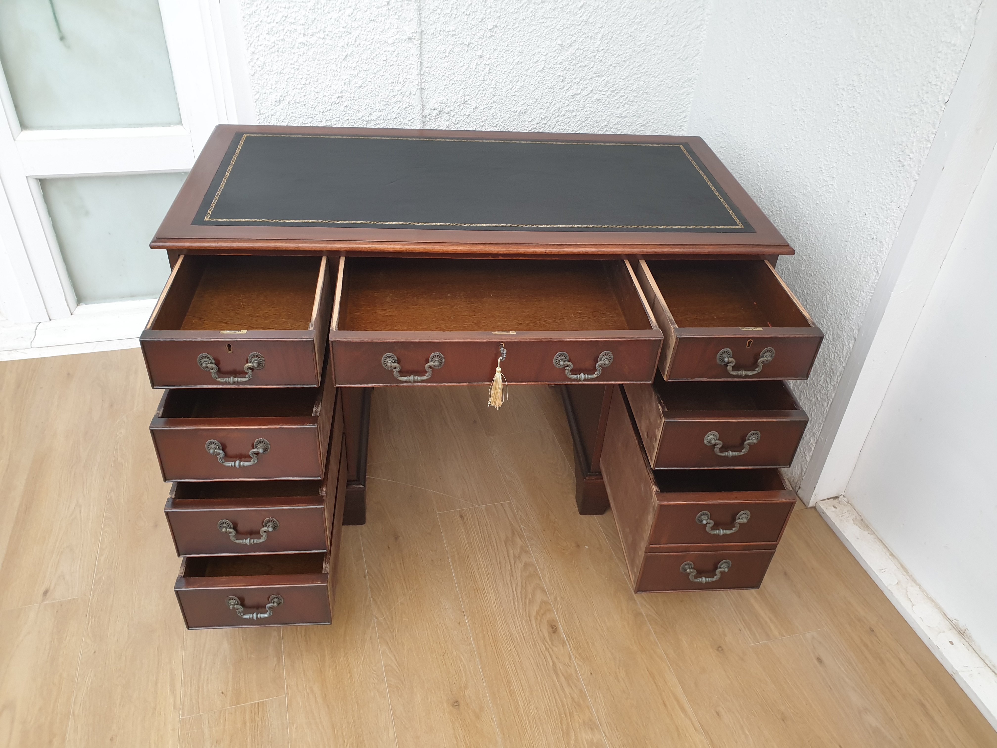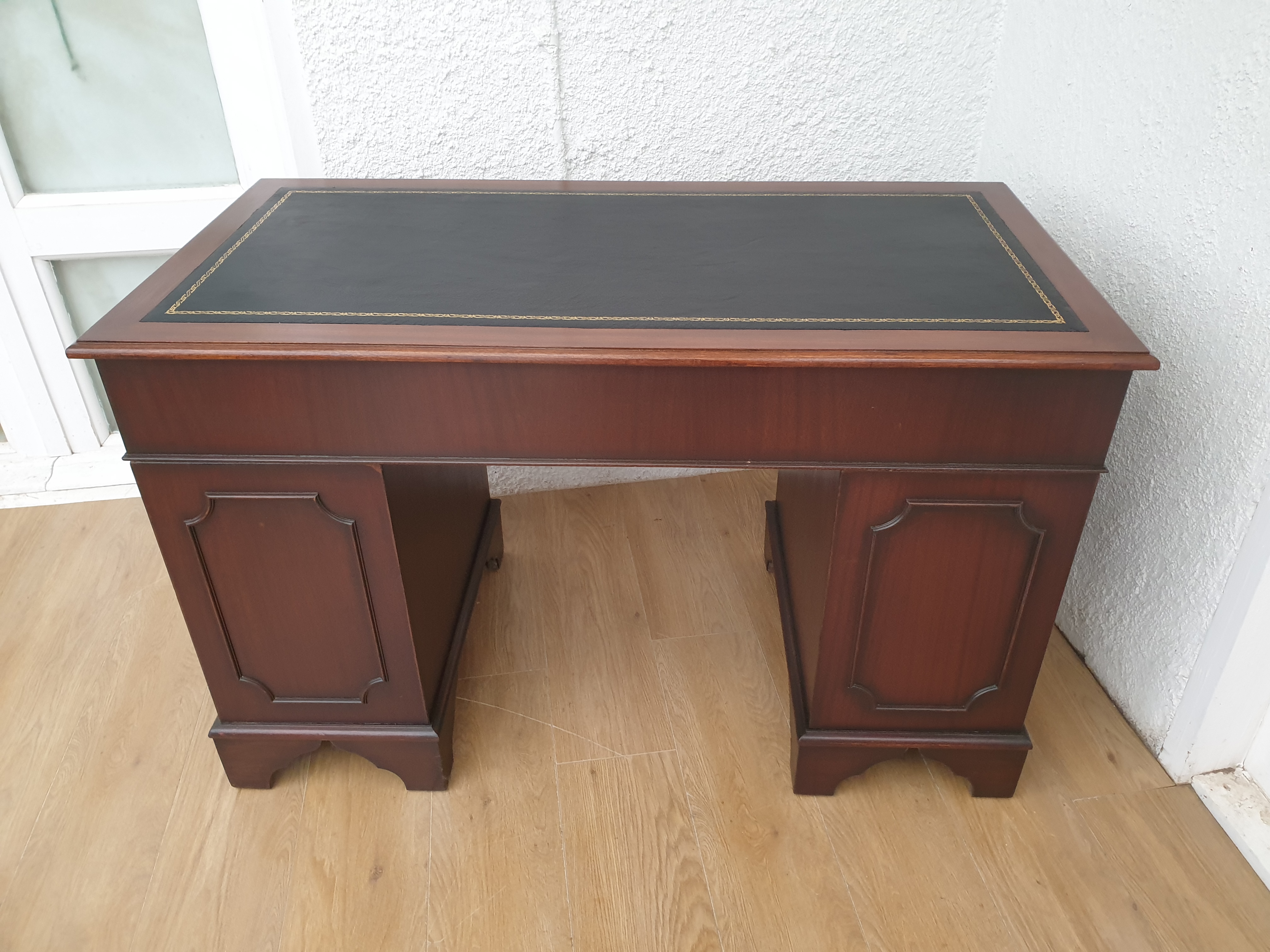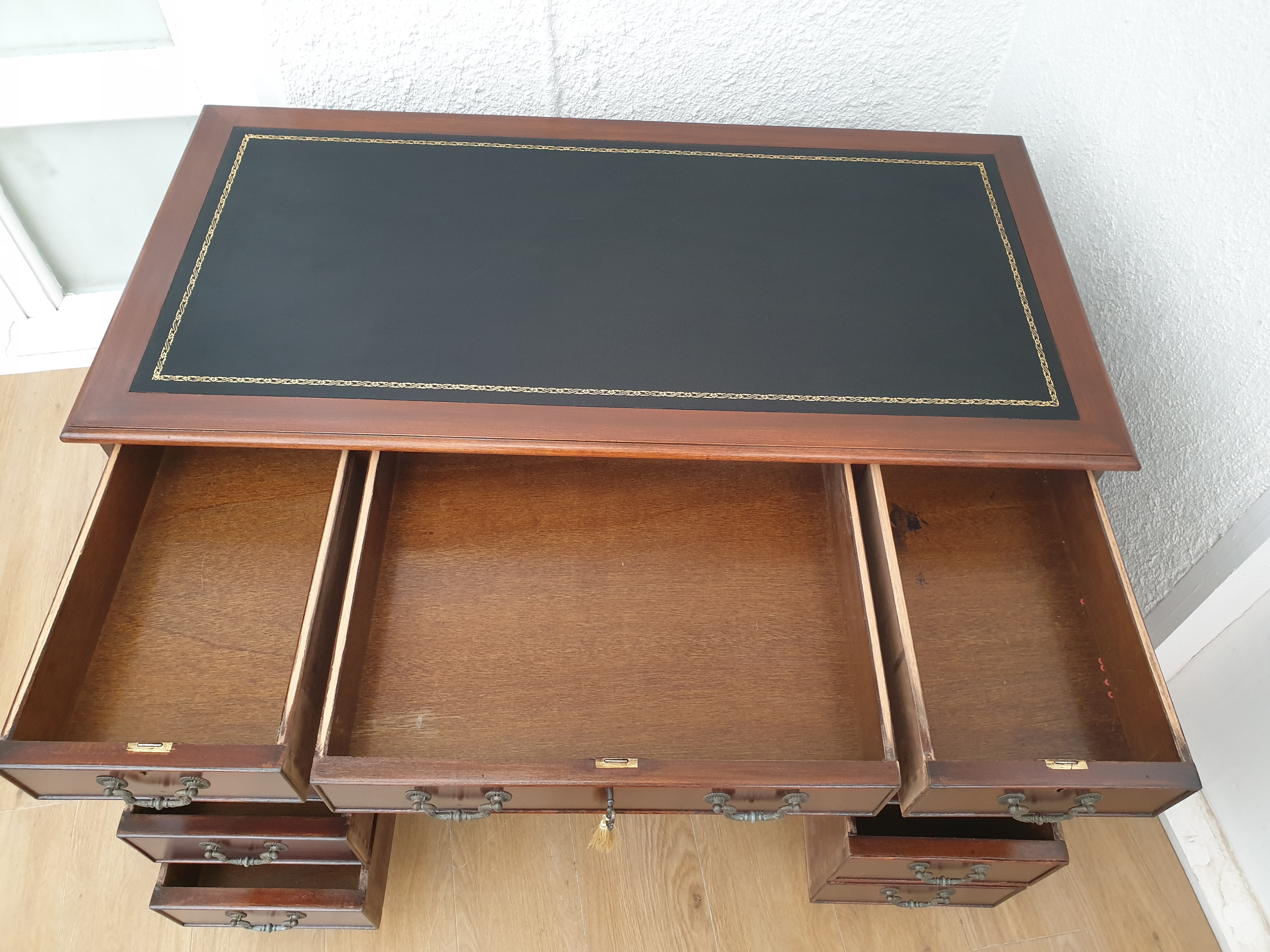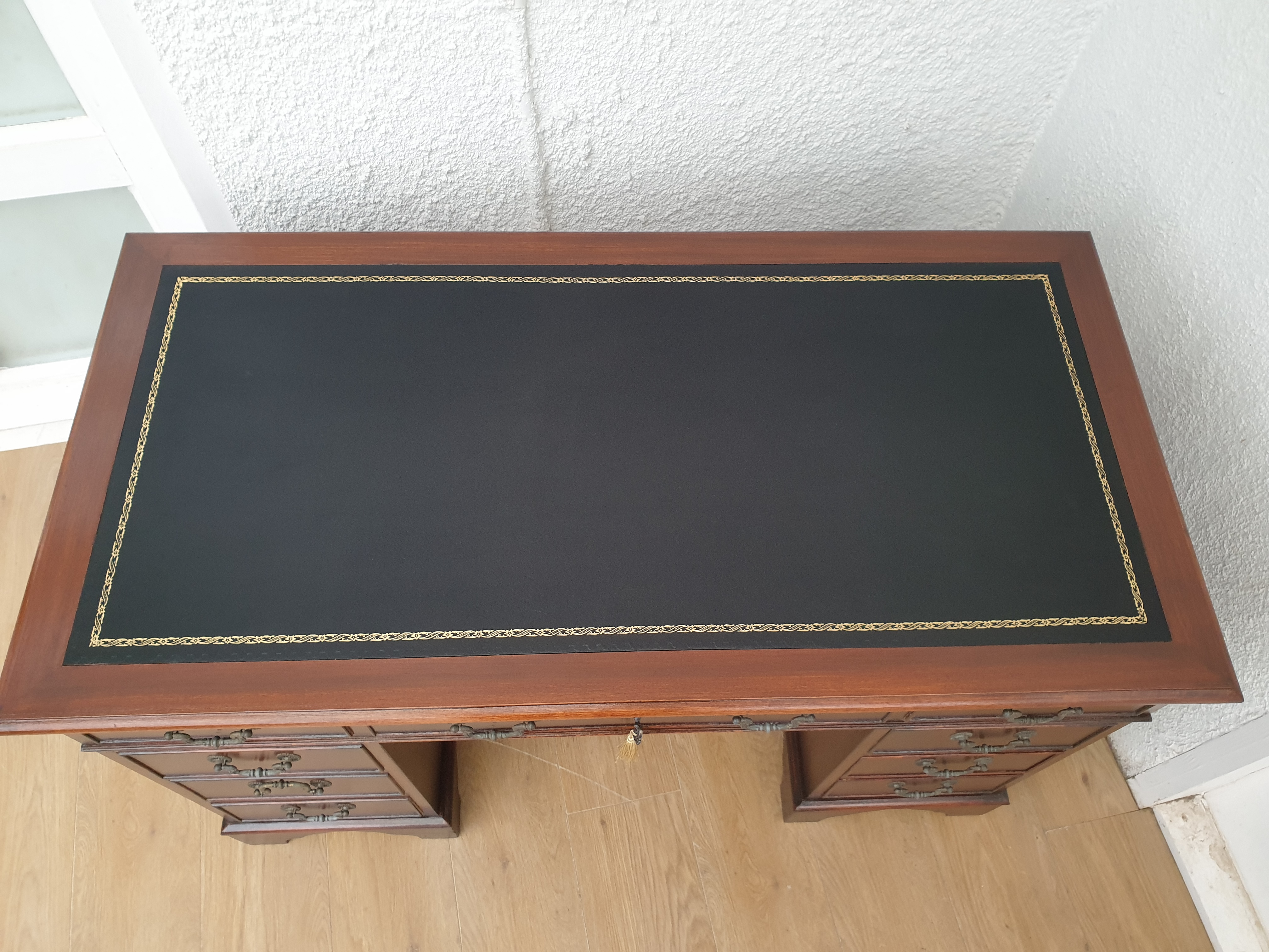 Beautiful captains desk from the second half of 20th century. It comes with a black leather top with gold tooling, which is in absolutely perfect condition. All wooden