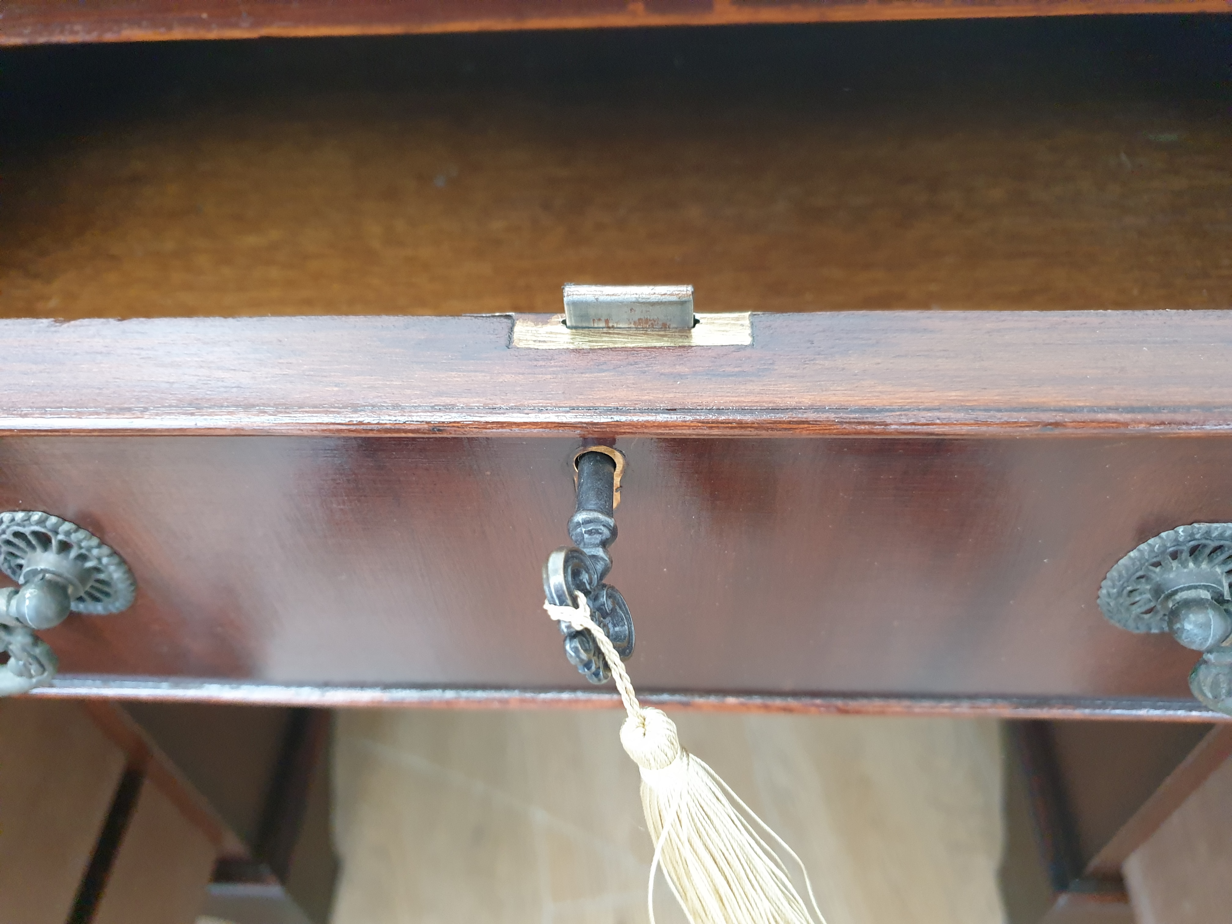 All drawers slide in and out easily as they should, and are very clean inside. All handles are original and are firmly in place. The desk has three working locks and