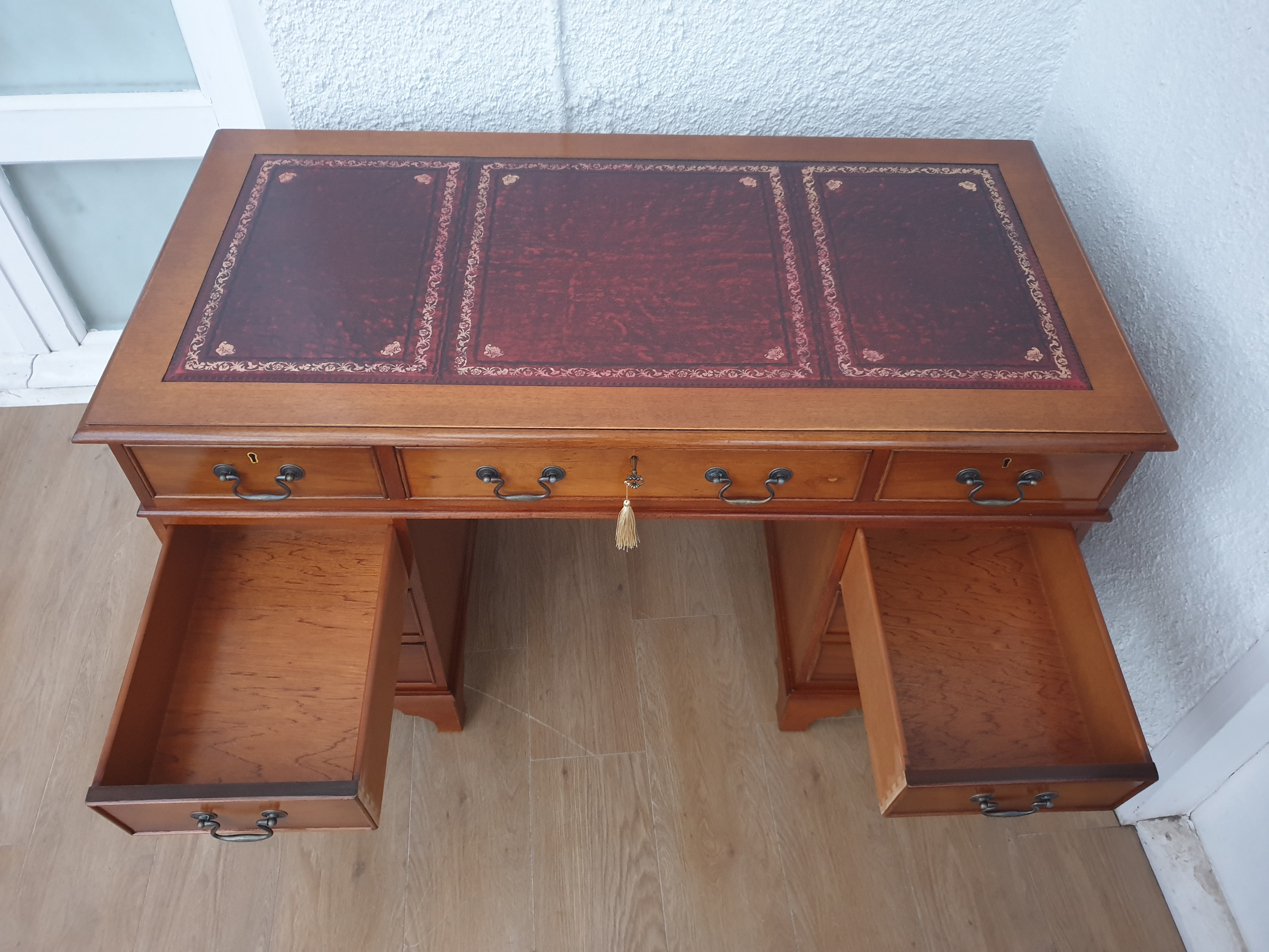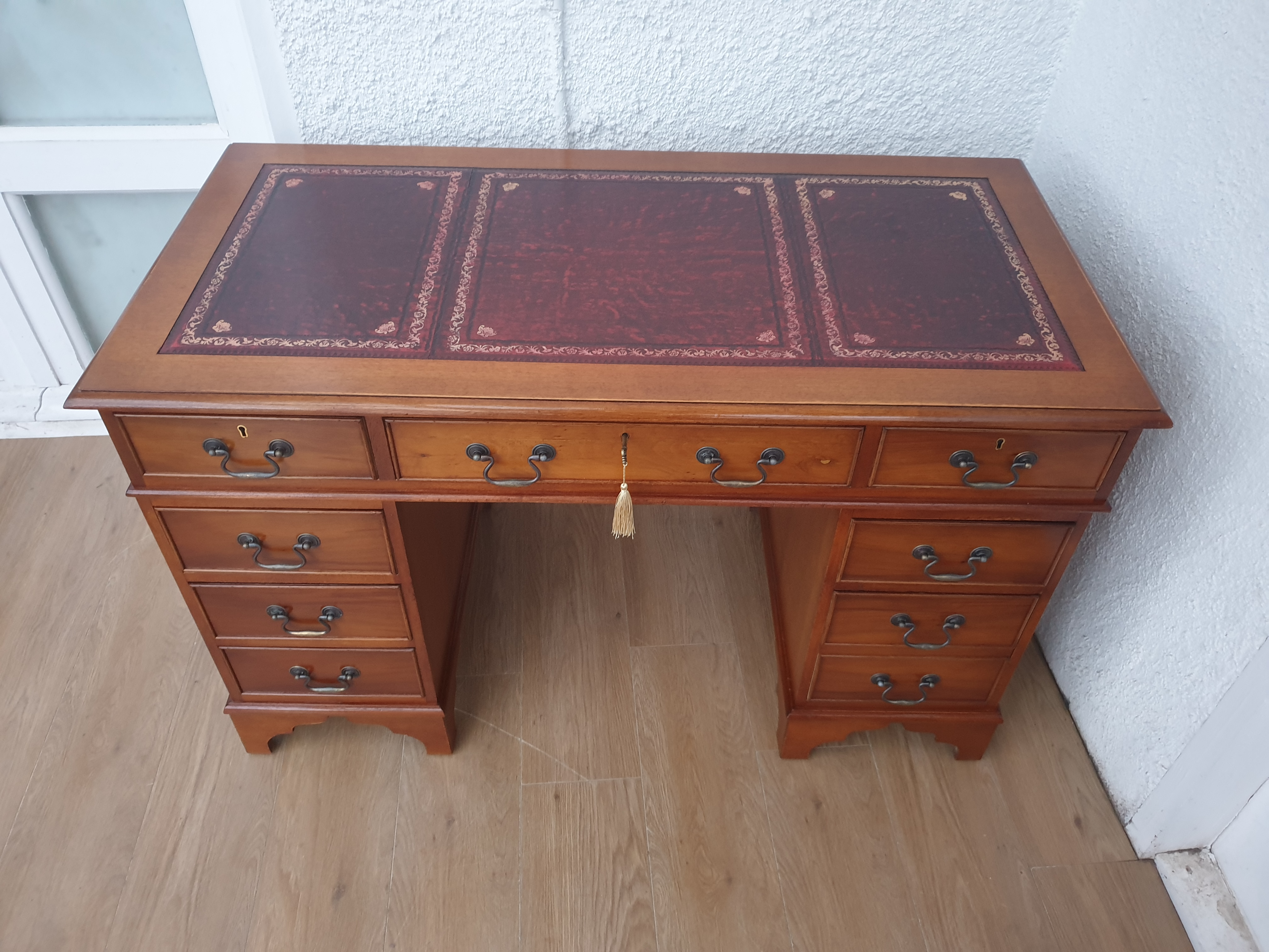 Beautiful captains desk from the second half of 20th century. It comes with original red leather top with gold tooling, which is in very good condition. All wooden