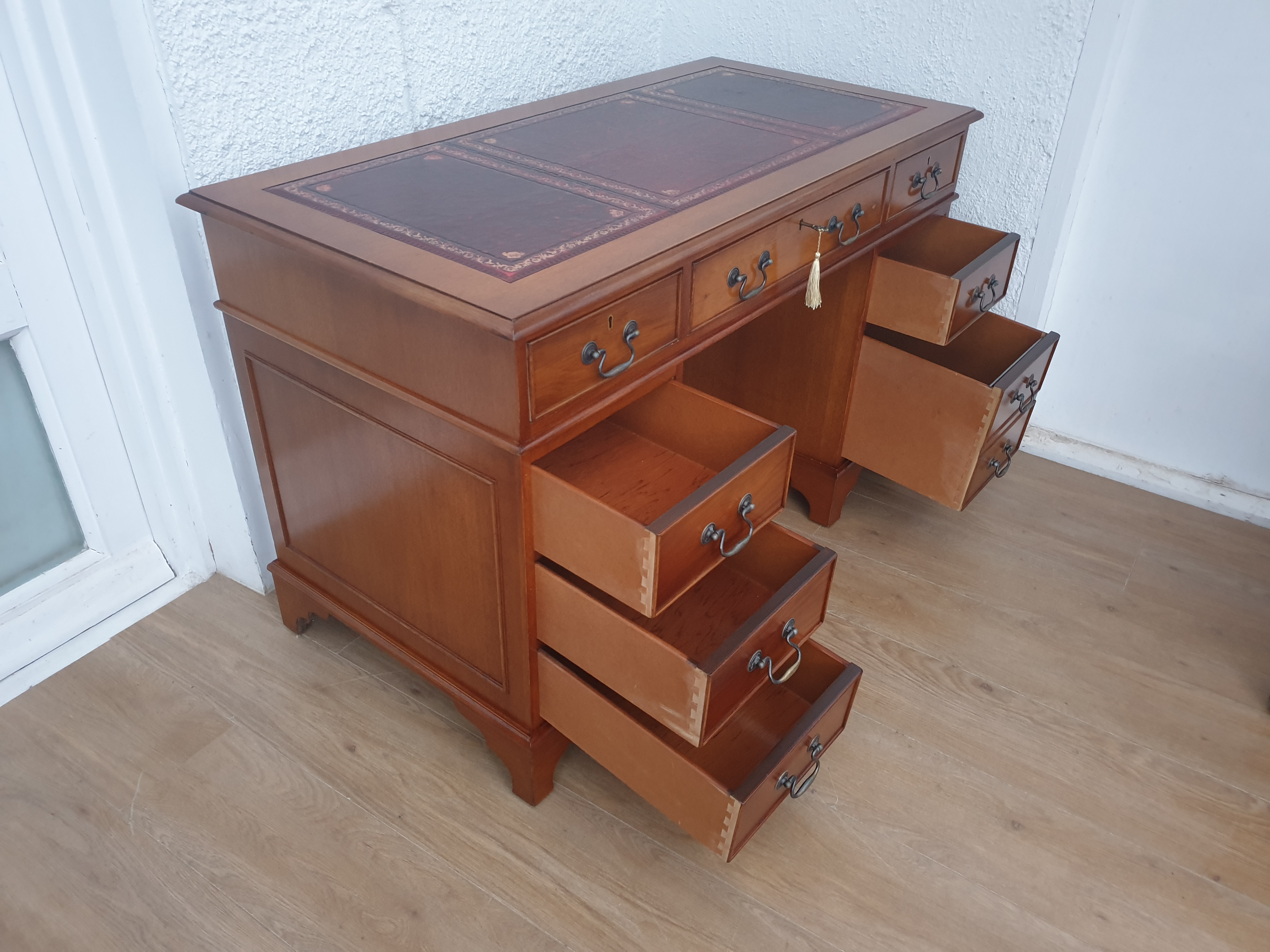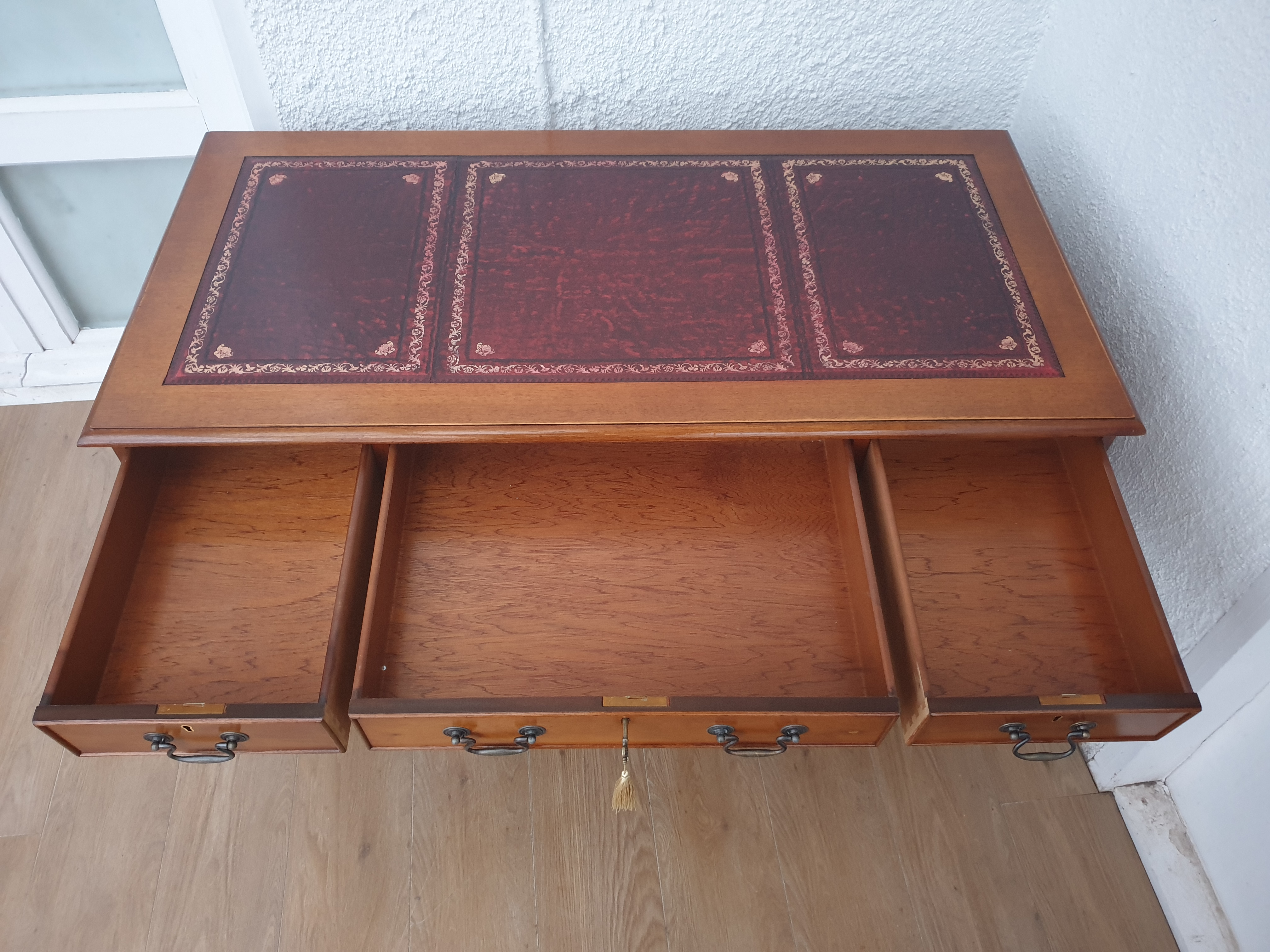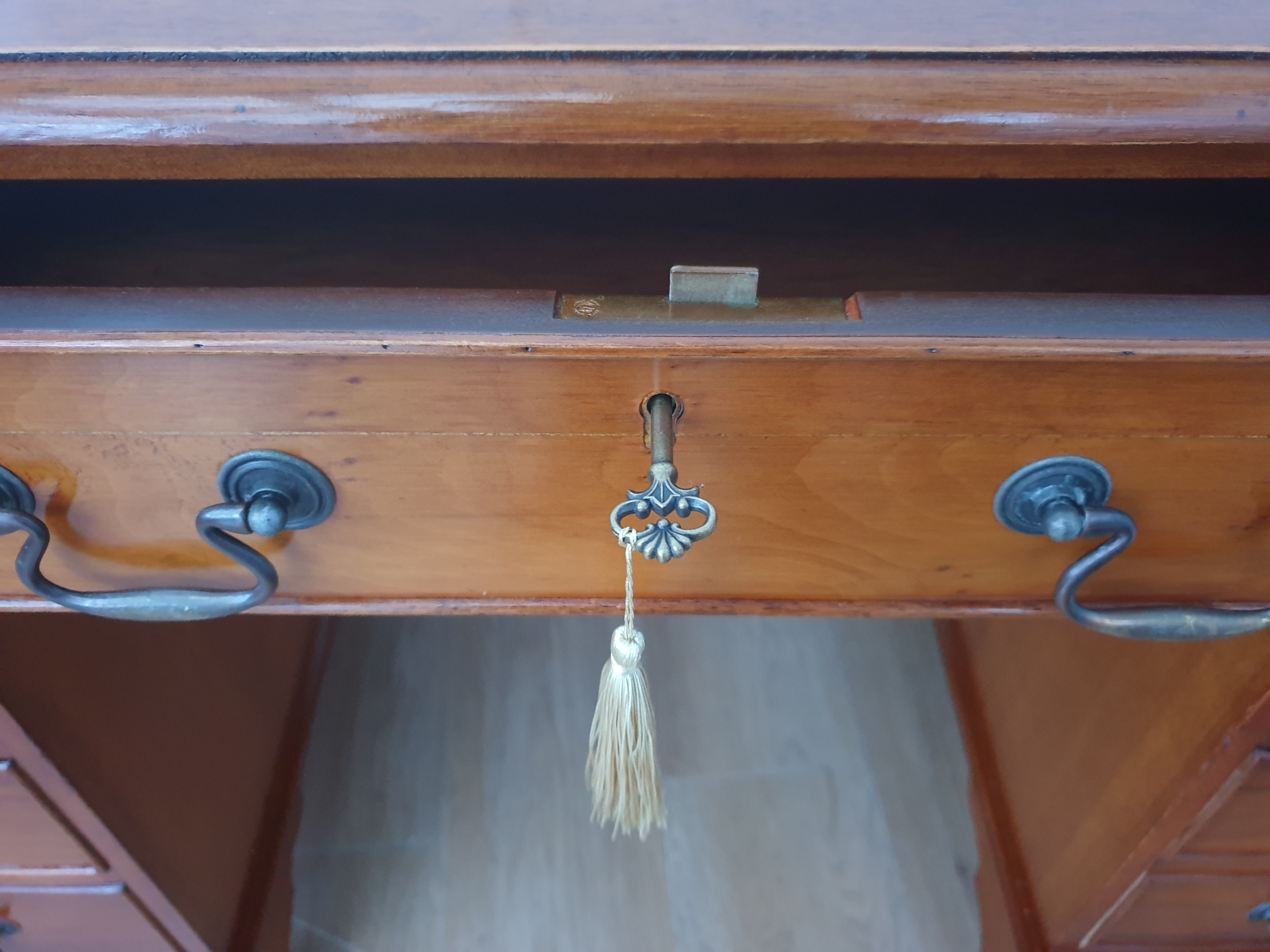 All drawers slide in and out easily as they should, and are very clean inside. All handles are original and are firmly in place. The desk has three working locks and