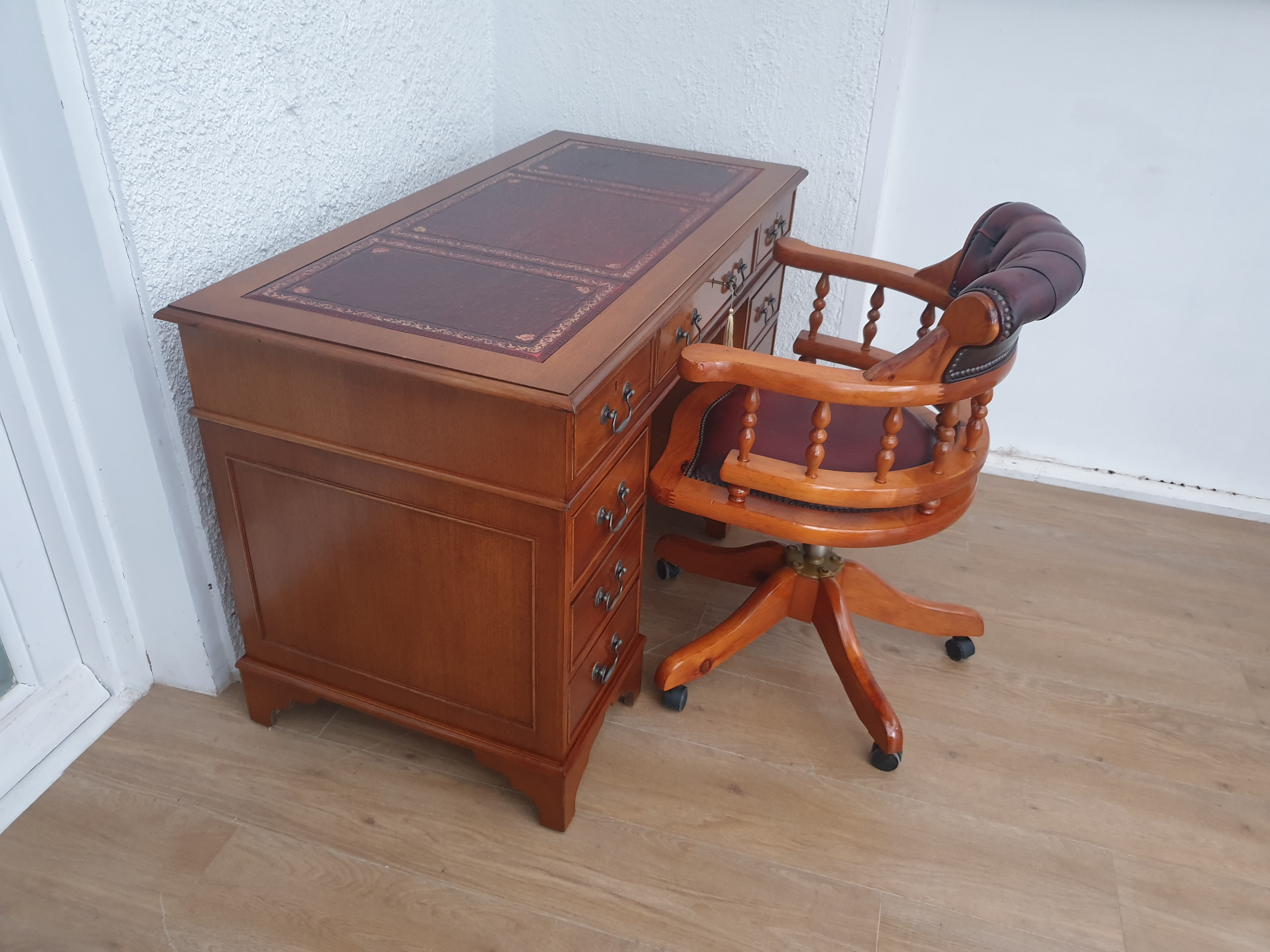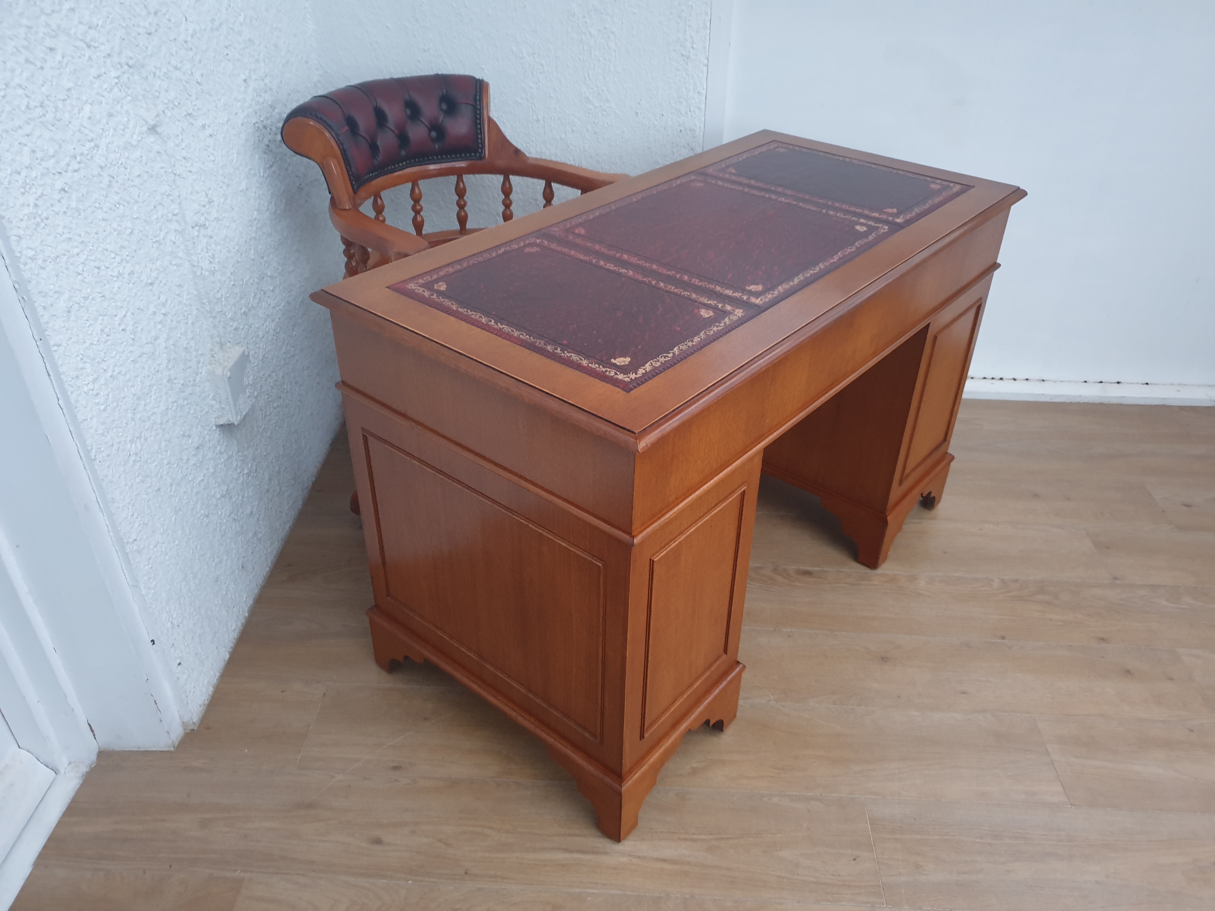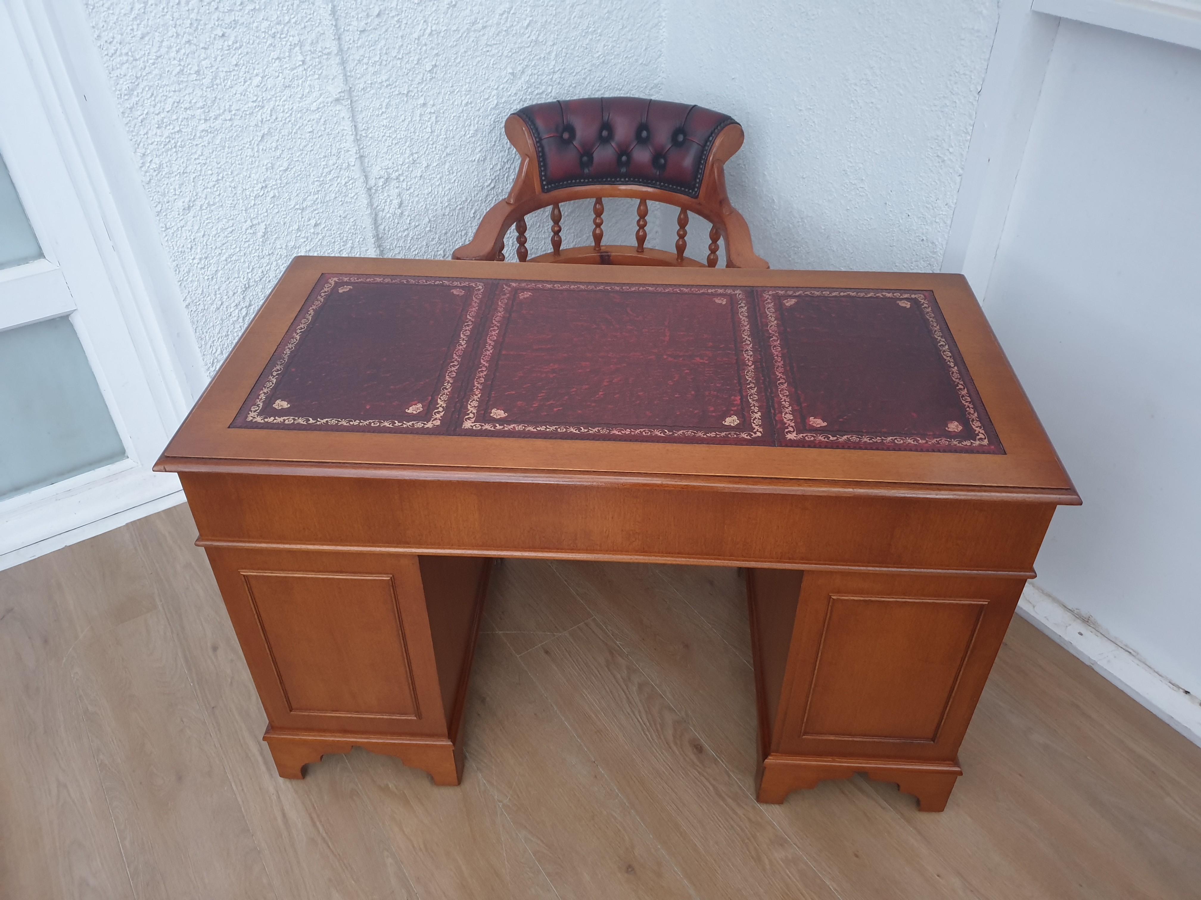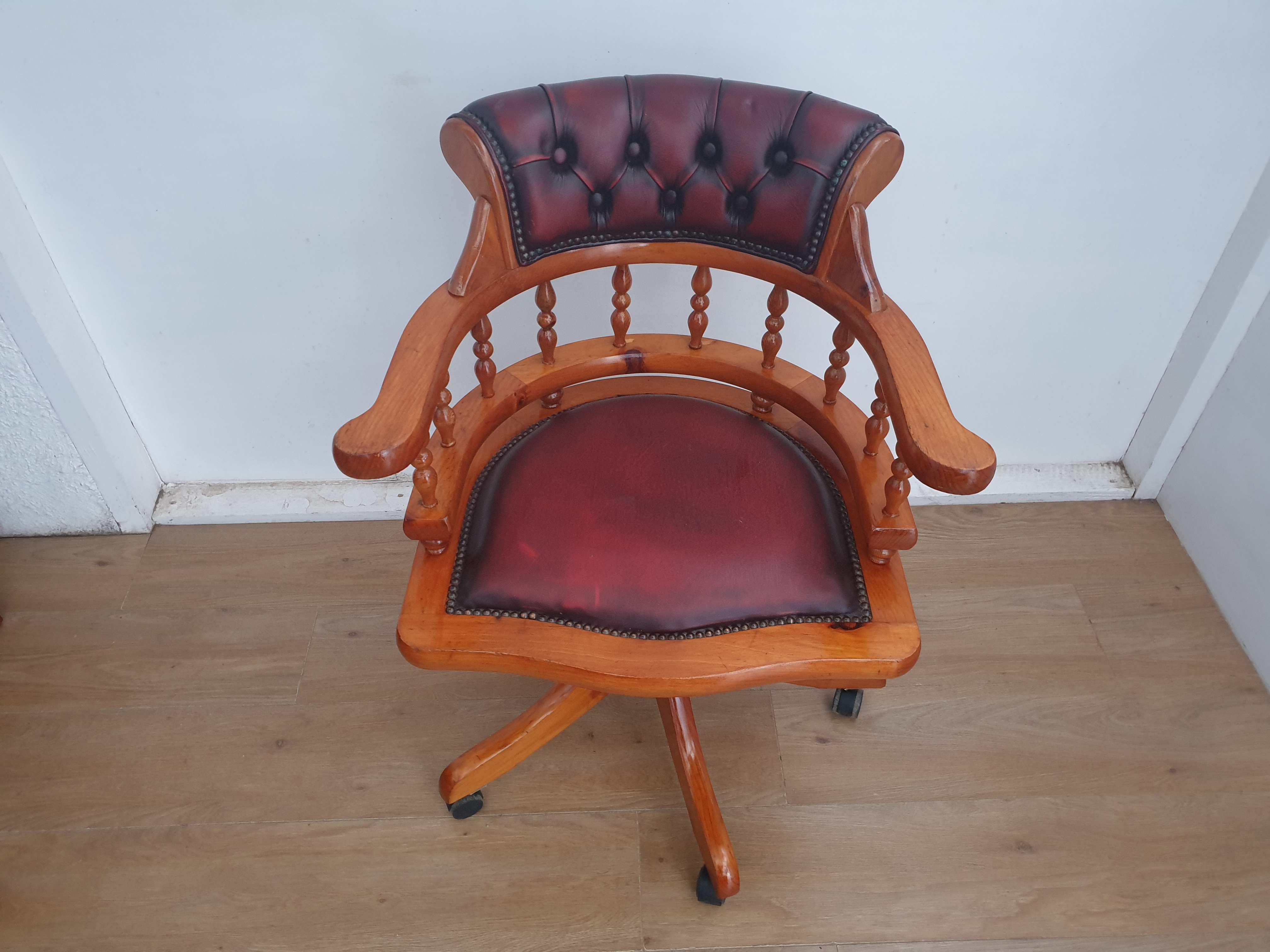 The desk comes with a matching captains chair on castors, which is in very good condition too. It solid, sturdy and does not wobble. The chair can swivel 360 degrees,